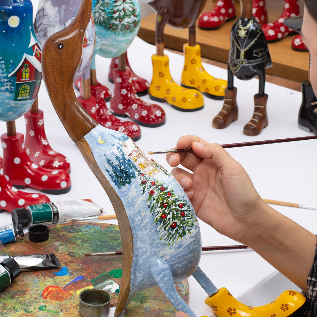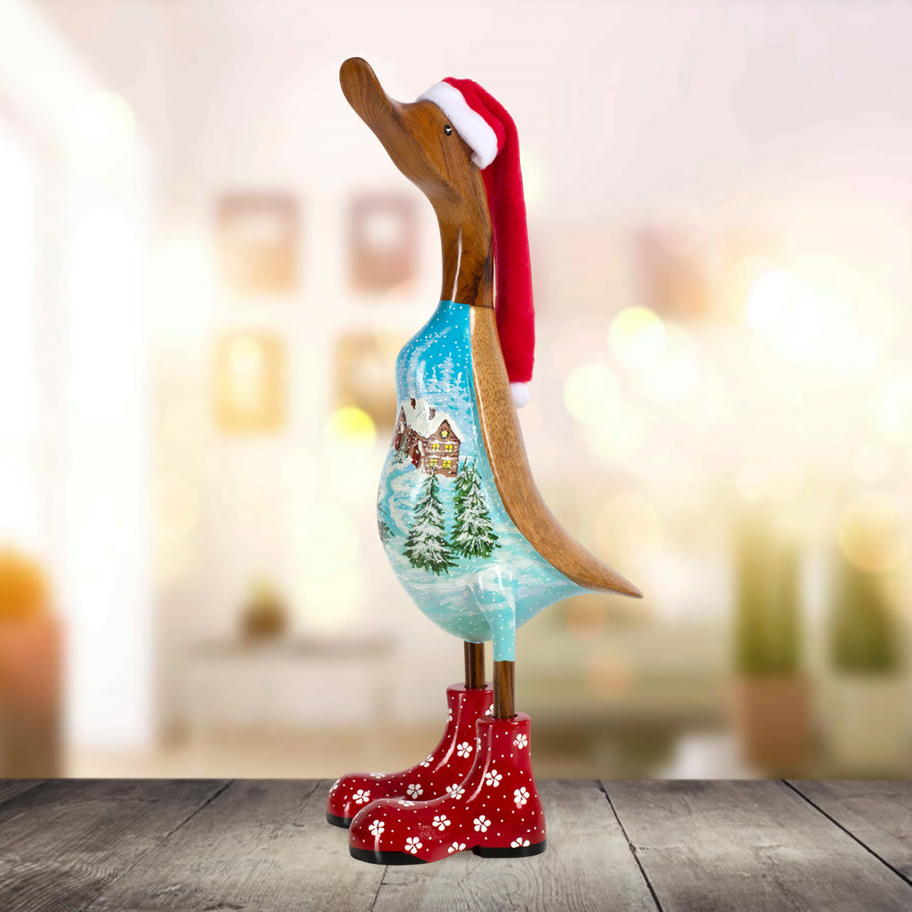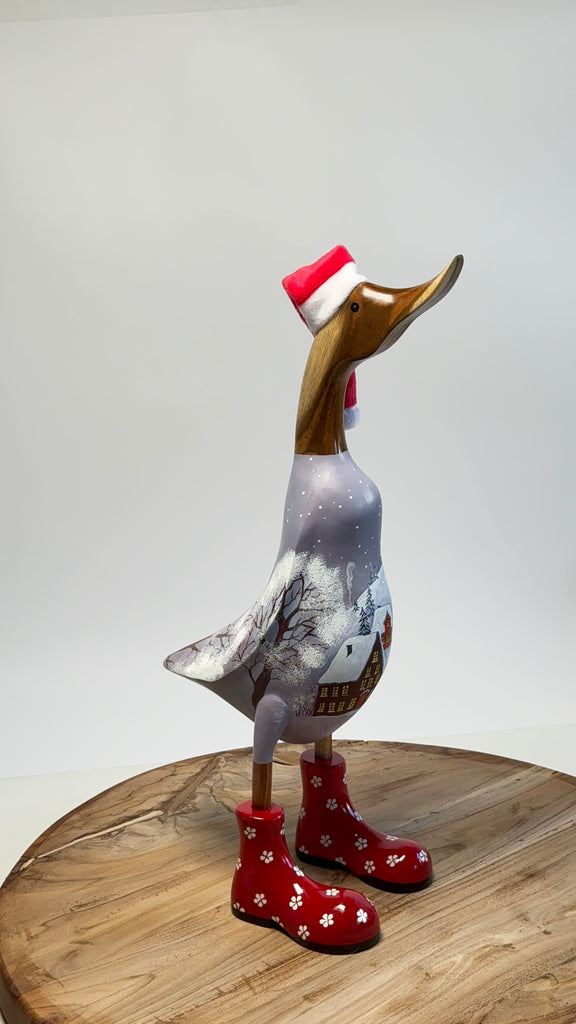 Handgeschnitzte gestiefelte Enten aus Holz: Die einmalige Holzmaserung und Handbemalung verleihen der Ente an Gemütlichkeit und Wärme. Ideal als Geschenk oder als Dekoration für Ihr Zuhause geeignet.
